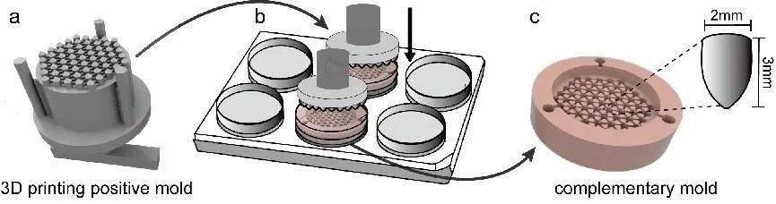 该文章基于3D打印模具构建了视网膜类器官培养系统,其微孔模具平台具有62个V型的小型培养孔,可以实现视网膜类器官的一站式长期培养(见下图)。