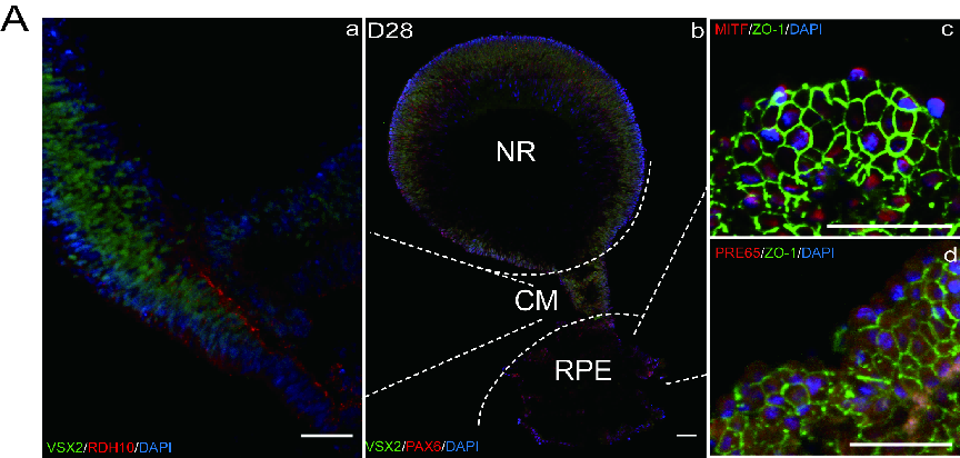 在培养过程中无须对类器官进行反复的转移及分选,既节省了研究者的时间,又降低了视网膜类器官的异质性。与传统的视网膜类器官培养方法比较,在该平台中产生的视网膜类器官,大小均一,活性好。在此基础上,其研究首次发现在PDMS平台中视网膜类器官呈现一种特殊的粘附3D克隆聚集生长状态,可以不通过常规视网膜类器官需要添加的转化生长因子超家族成员之一的BMP4及视网膜色素上皮细胞相关诱导,便可以在早期均匀的产生携带有视网膜色素上皮细胞(RPE)、睫状缘干细胞(CM)和视网膜神经层(NR)的视网膜类器官(见下图)。