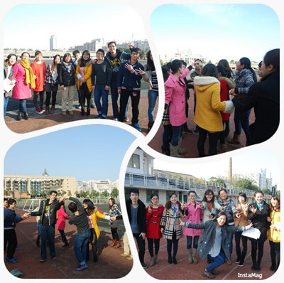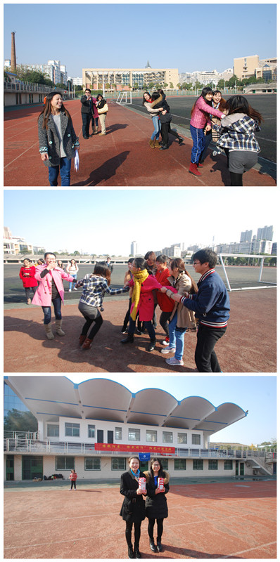 “心有灵犀”猜词游戏是考验大家默契程度的环节。首先,将同学们分成三队,每队推选一名表演者,并通过集思广益的方式产生队名,然后由主持人给出词汇 ,每队表演者通过动作和语言传递信息,解说时不能谐音,不能使用英语直接进行替换解说,且队内的成员不得提示,时限2分钟,答题正确数量队获胜。经过一番激烈角逐,“一猜即中”队拿到了冠军,作为奖励,由冠军队要求出局队“二师兄队”表演舞蹈《小苹果》。“二师兄队”队长何景良同学“不负众望,以身作则”,带领队员们“翩翩起舞”表演自创广场舞小苹果,引来了体育场上阵阵欢快的笑声。