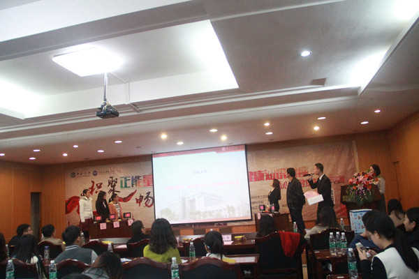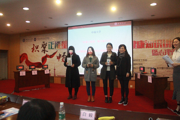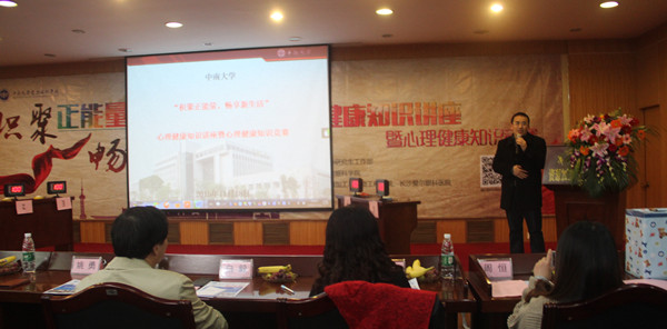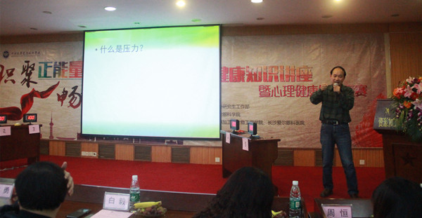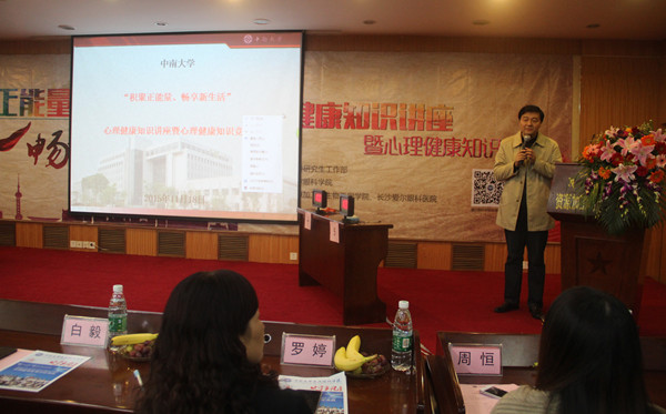 2015年11月18日晚,中南大学“积聚正能量、畅享新生活”心理健康主题活动成功举行。此次活动由中南大学党委研究生工作部主办,爱尔眼科学院承办,资源加工与生物工程学院、长沙爱尔眼科医院协办。活动采取“讲座+心理知识竞赛”模式,旨在普及心理心理健康知识,宣传正能量。中南大学党委研究生工作部姚勇副部长、爱尔眼科学院白毅书记、资源加工与生物工程学院朱忠平副书记、中南大学精神卫生研究所副所长王小平教授、基础医学院学工办罗婷主任、资生院刘若华老师、材料科学与工程学院周恒老师出席活动。