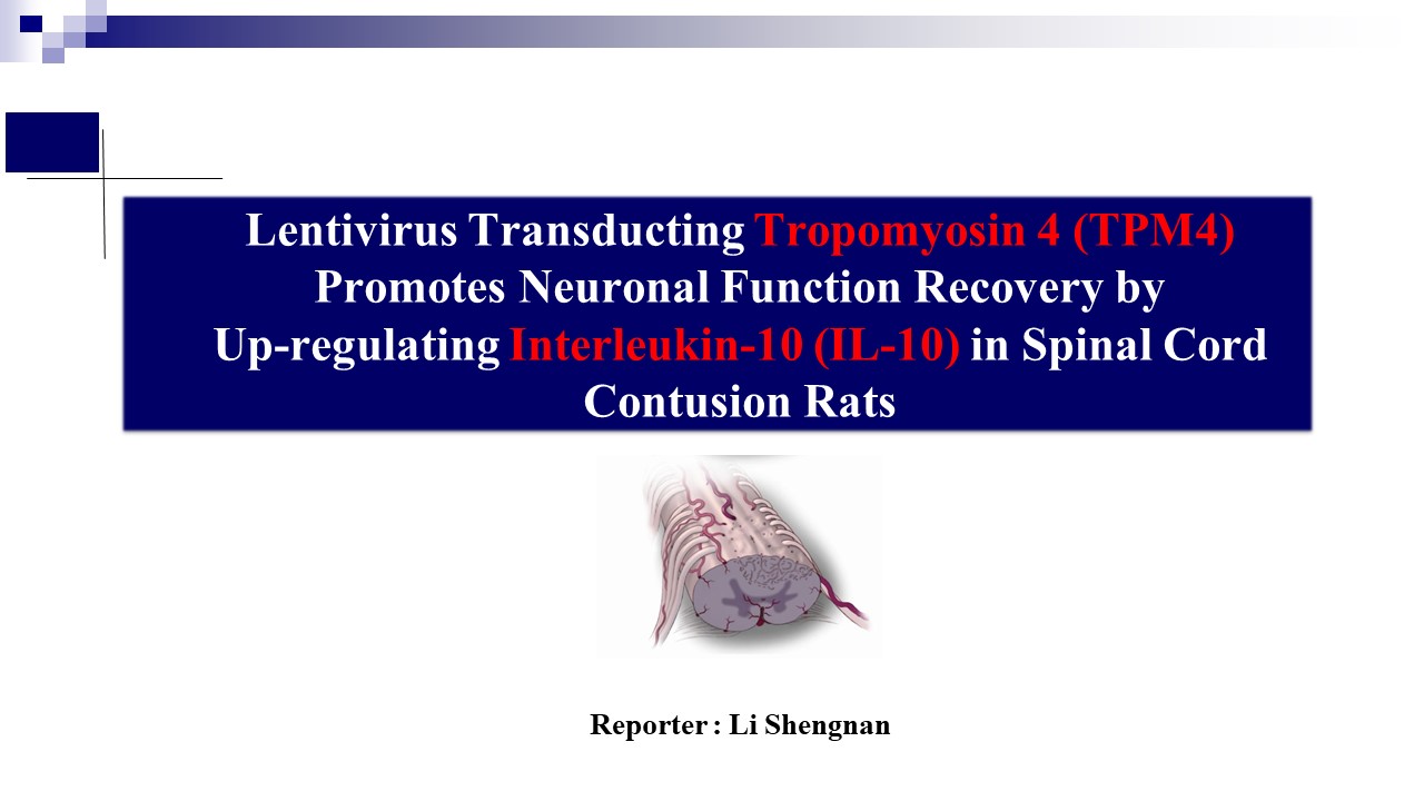 “中国大学生5分钟科研英语演讲”大赛旨在提高我国高校本科生和研究生使用英语进行科研创新和学术交流的能力,其基本内容是用英语向无专业背景的听众介绍自己的科研成果或科研想法。我院学子李胜男以“Lentivirus Transducting Tropomyosin 4 (TPM4) Promotes Neuronal Function Recovery by Up-regulating Interleukin-10 (IL-10) in Spinal Cord Contusion Rats”为演讲主题,荣获研究生组决赛一等奖。