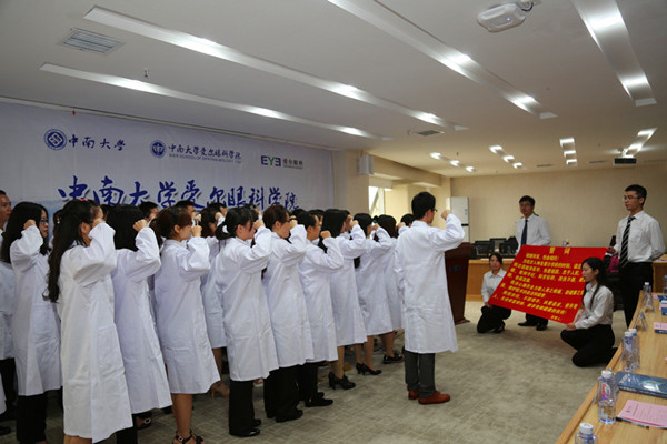 学子们从导师手中郑重接过象征神圣与光荣的白大褂,救死扶伤的医生职责将融入到每一个医学生的学习生涯乃至整个人生生涯。“救死扶伤,不辞艰辛,执着追求,使所有人,无论贫富贵贱,都享有眼健康的权利!”40名2015级新生高举右手,齐诵爱尔医学生誓言,心潮澎湃热血沸腾。